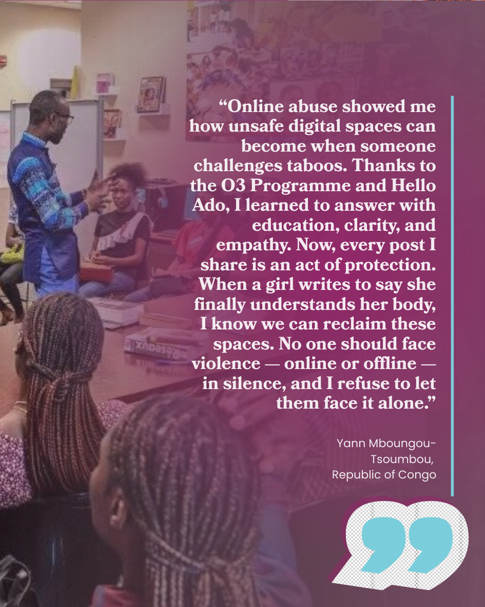Yann’s journey is not an isolated story. It reflects the broader change set in motion by the WCA Commitment for educated, healthy and thriving adolescents and young people in West and Central Africa. In the Republic of Congo and beyond, the O3 Programme and initiatives like Hello Ado support countries in turning this regional vision into concrete action: tackling menstrual stigma, preventing gender-based and digital violence, and creating safer learning and online spaces for every adolescent. By standing up for girls’ dignity and mobilising boys as allies, Yann shows how the engagement AOC lives through the daily choices and courage of young people.